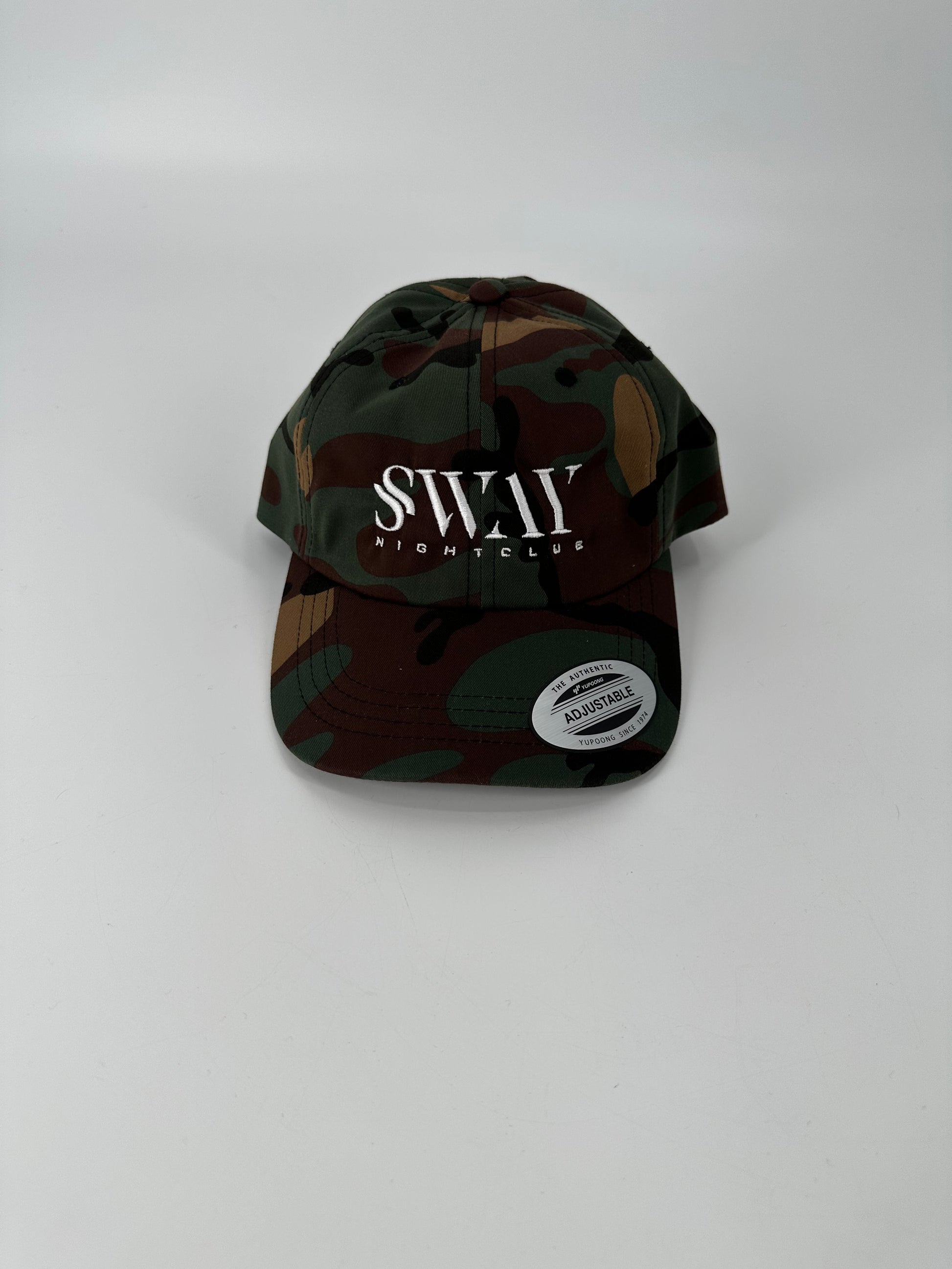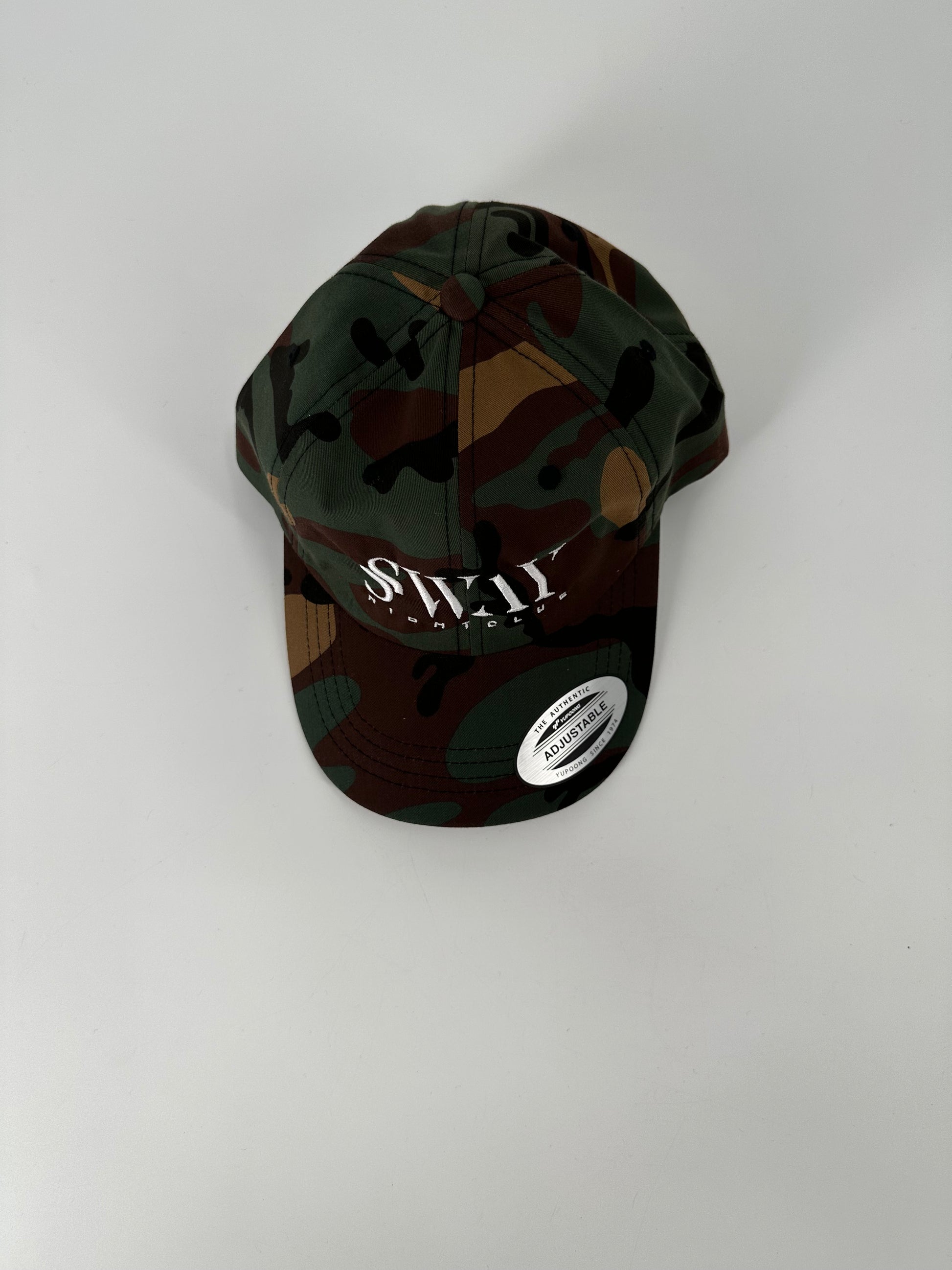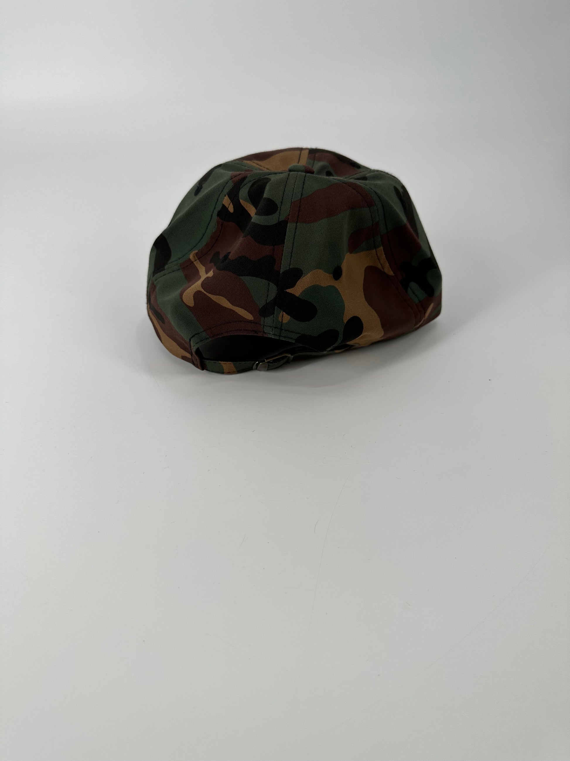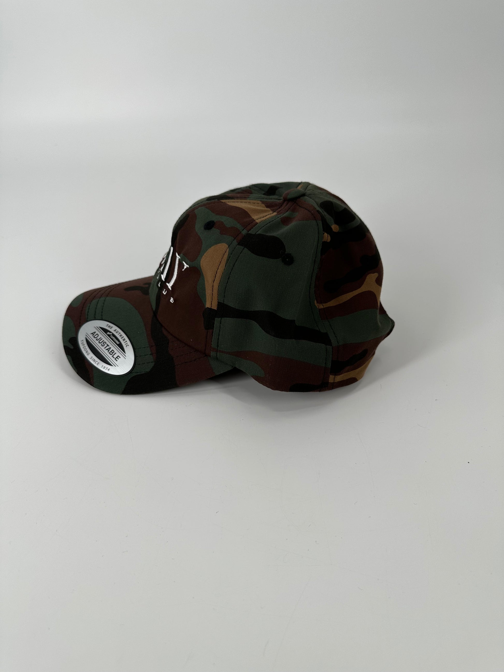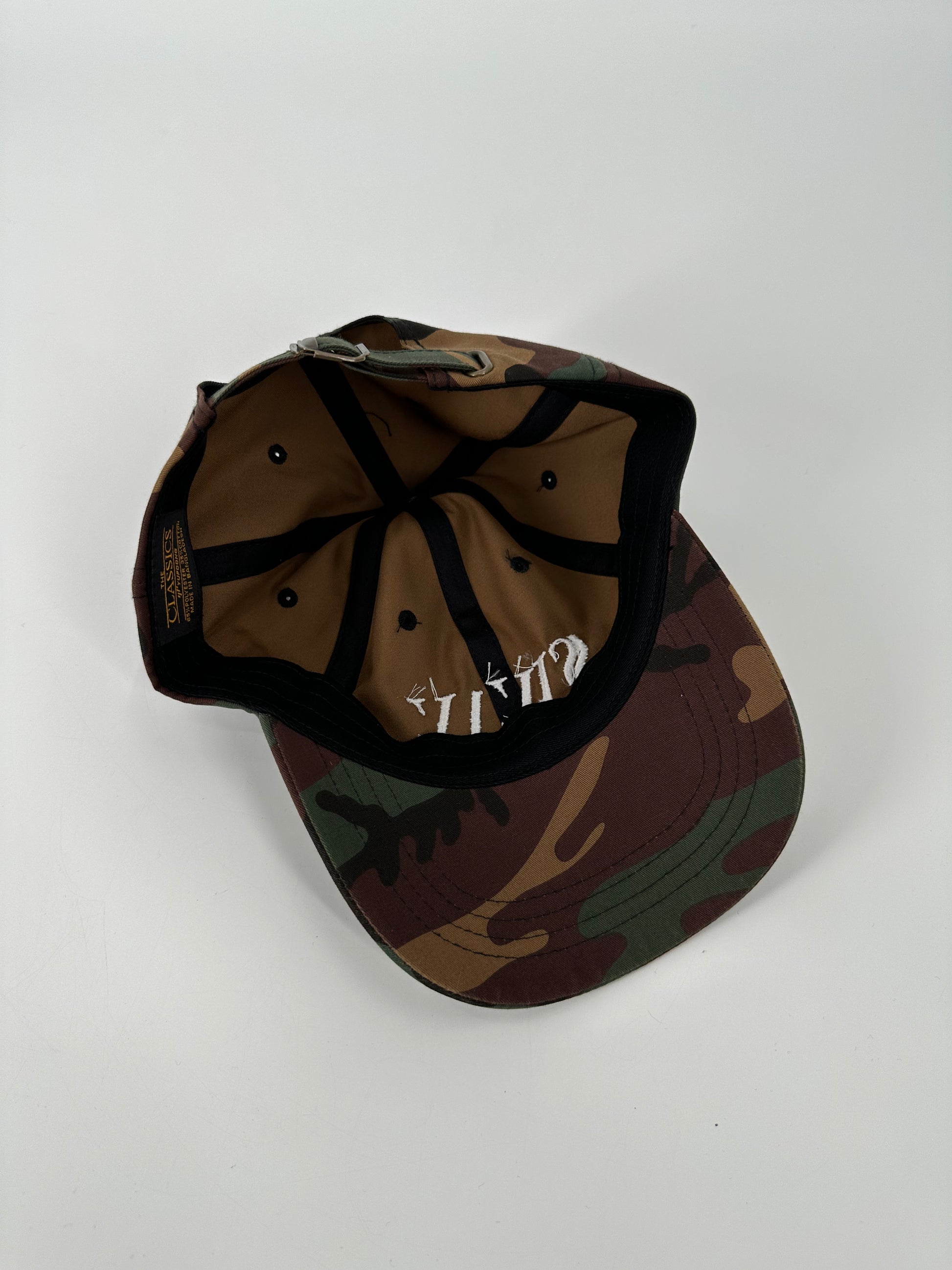 White/camo. Six-panel construction features an embroidered text graphic at the front with a curved brim. Finished with an adjustable strapback closure.