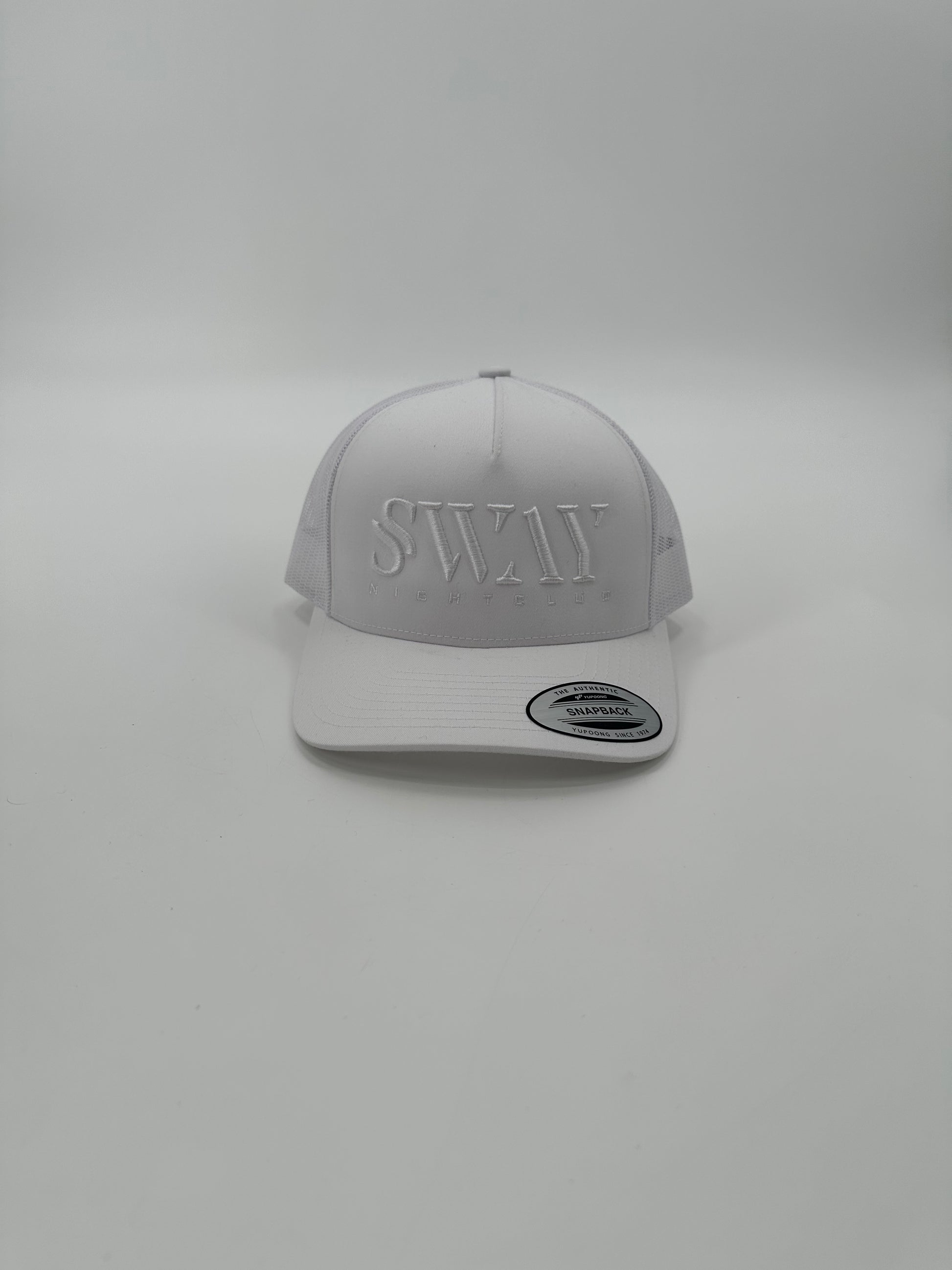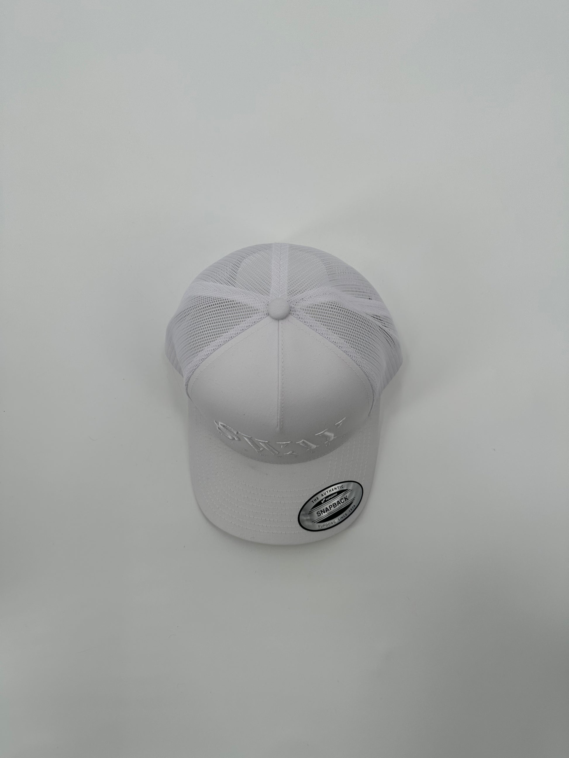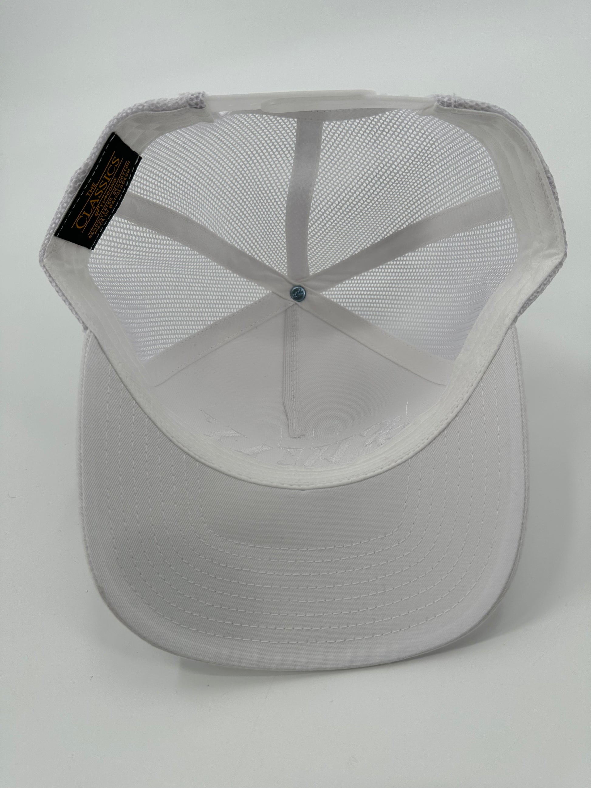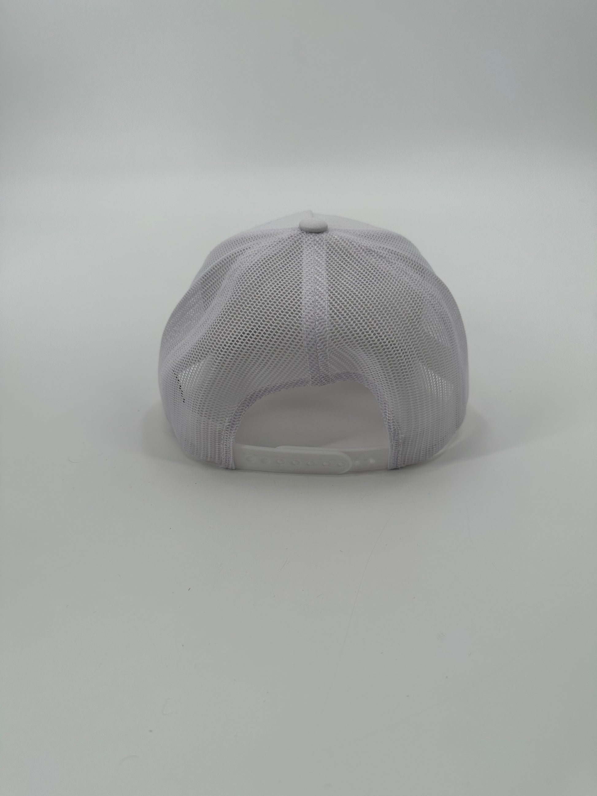 One size fits most. Adjustable. Cap shape. White, mesh. Matching plastic snap and undervisor. White hat with White lettering.